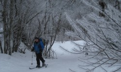 Départ pour le col du Merlet sous les nuages, la météo annonce une journée couverte et froide … les arbres du bord du chemin sont couverts de fantastiques aiguilles de givre. Nous montons vers le plafond nuageux. Lorsque nous y entrons la bise se lève et le froid devient très pénétrant. Mais rapidement nous quittons l’hiver pour le printemps, nous sommes passés au dessus. Une bonne dizaine de cm de poudre […]